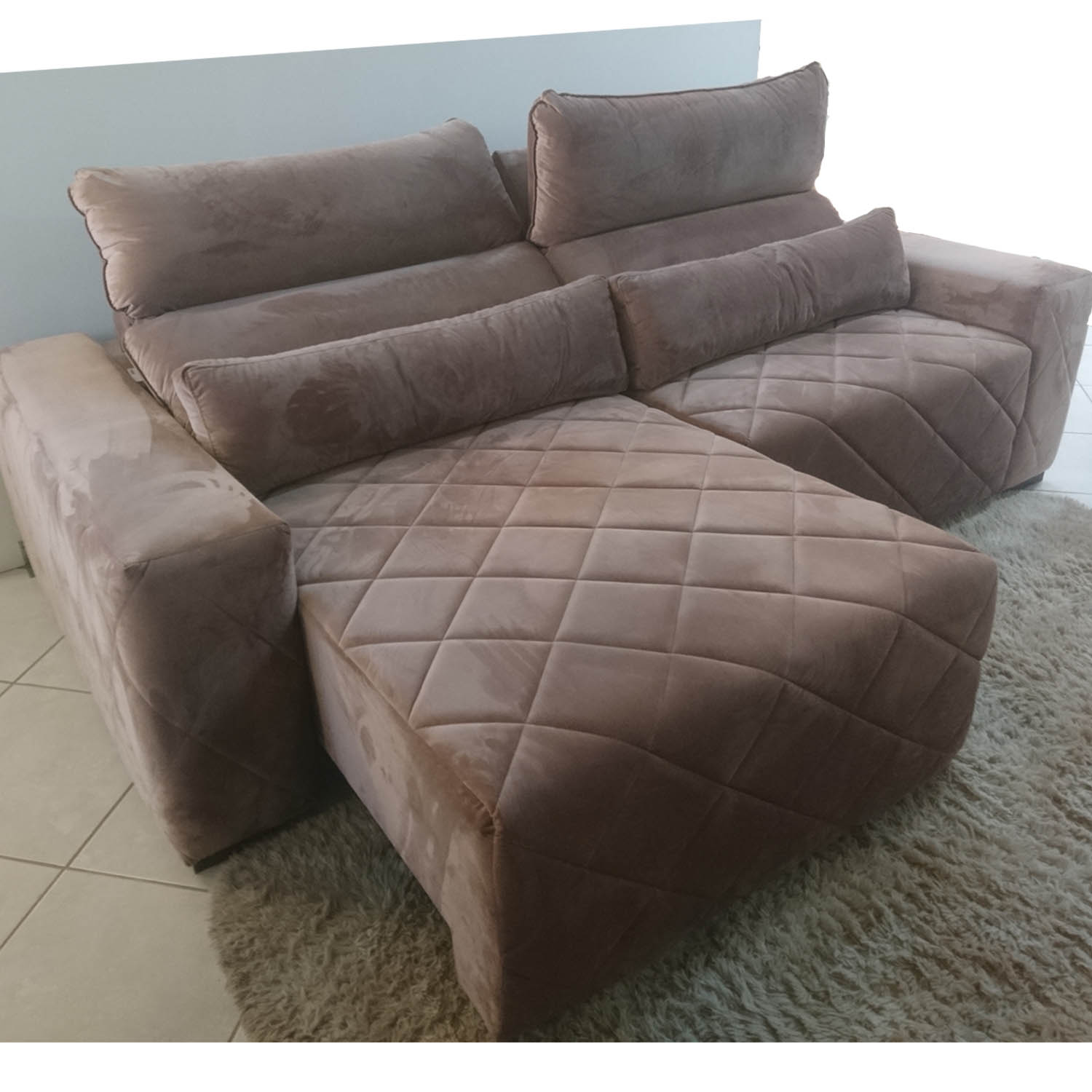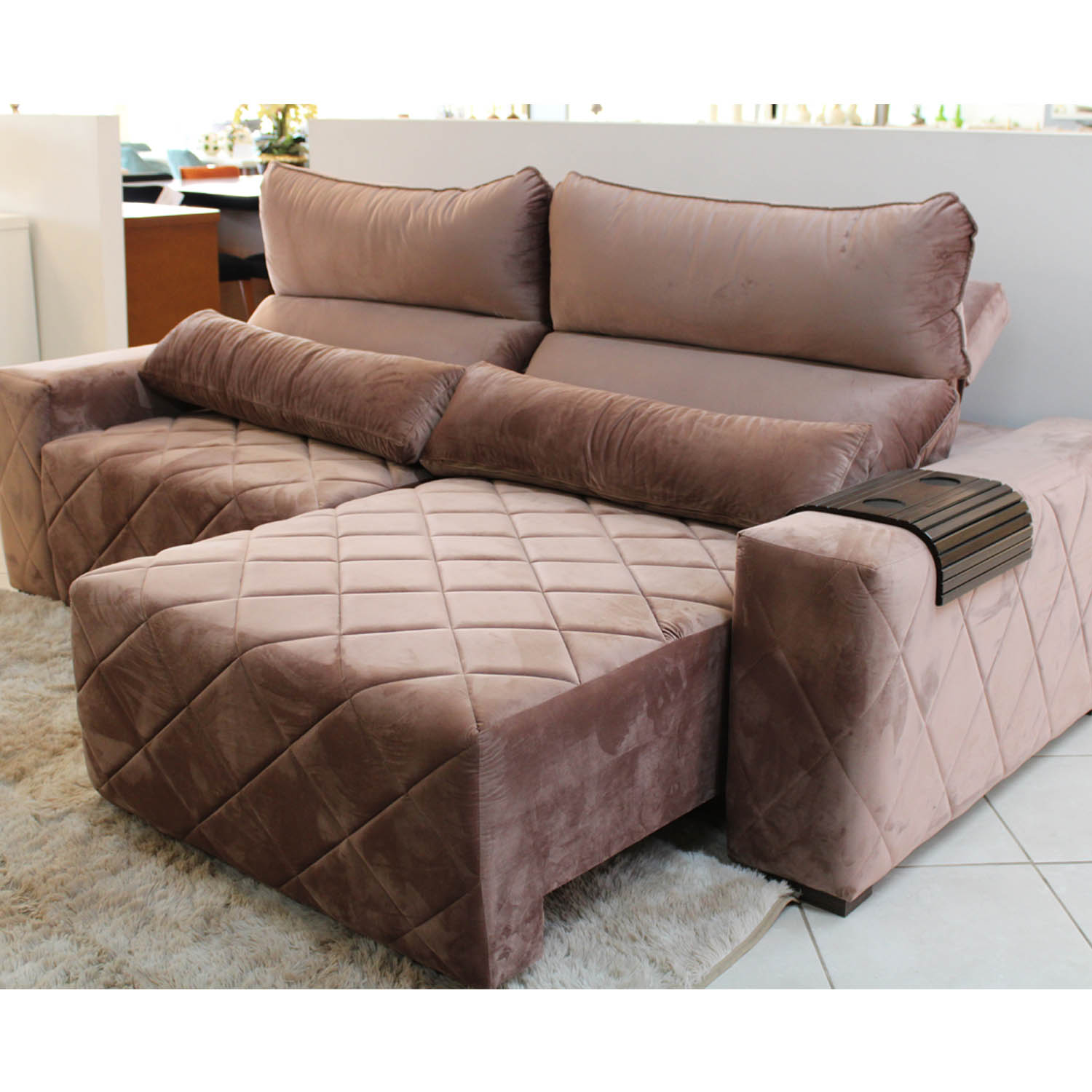 Inclui um sofá modelo Pérola com assentos reclináveis e retrateis com tamanho 2500mm com cor predominante rosê GR 12